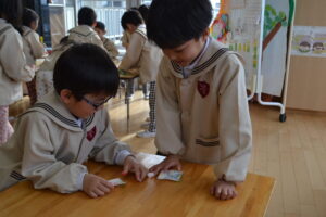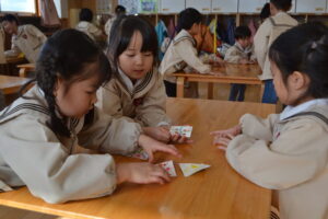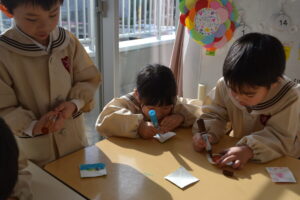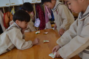 ぎゅうに牛乳パックを使ってこまを作りました。