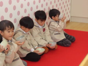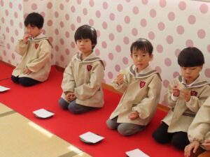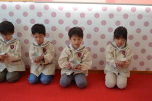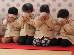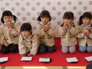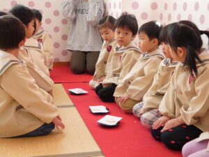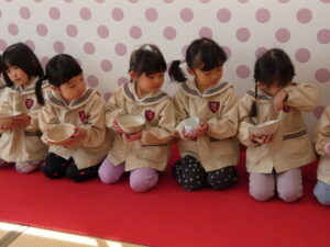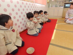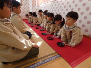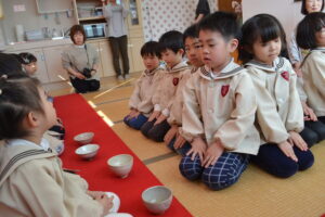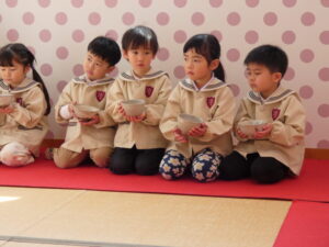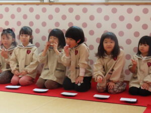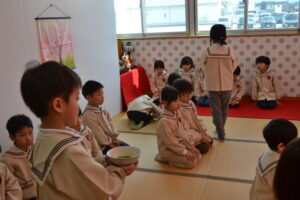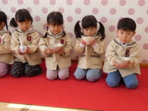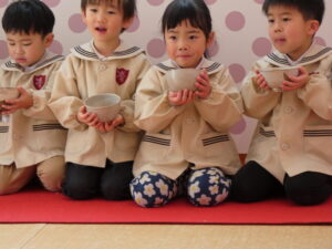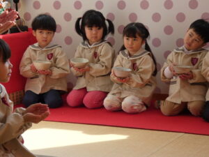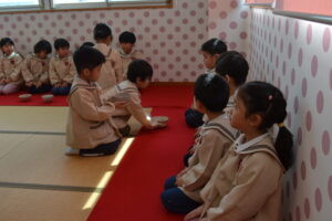 5歳児にお菓子とお茶を運んでもらいました。