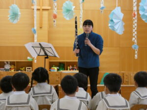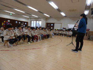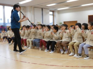 職員から楽器でお祝い