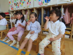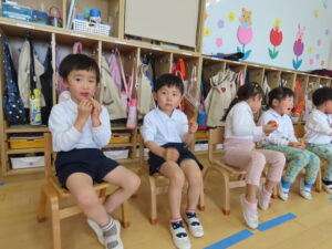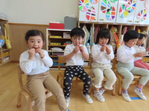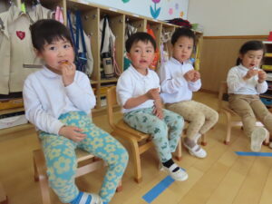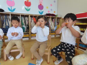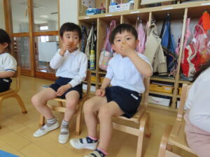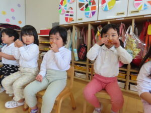 お部屋の外のテラスで給食を食べました!